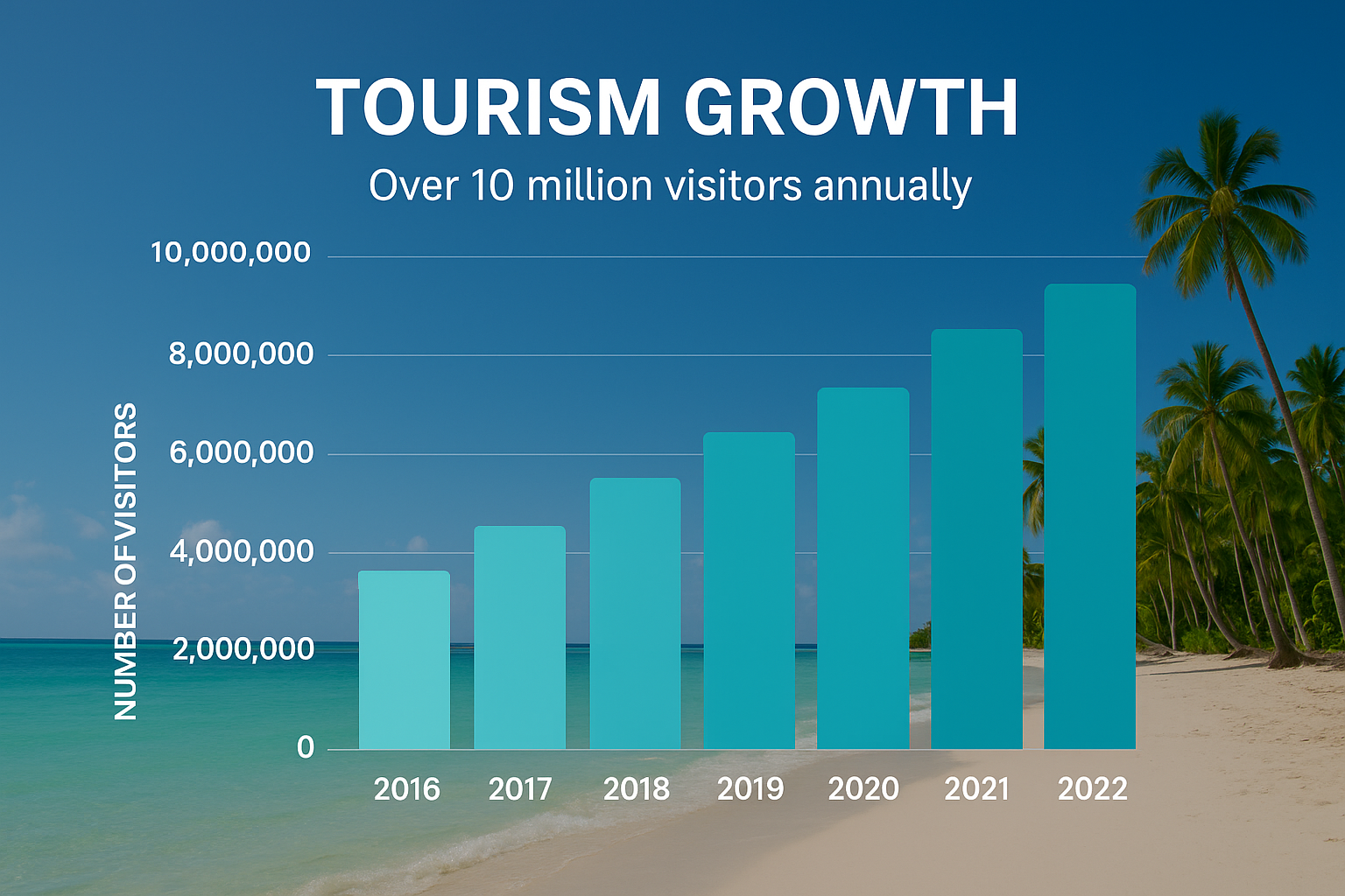 The country welcomes over 10 million visitors annually, and this number continues to increase year after year. Punta Cana, Bávaro, and Santo Domingo stand among the top destinations, guaranteeing high occupancy rates for vacation rentals and consistent rental income.